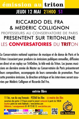Le Conservatoire national supérieur de musique et de danse de Paris et le Triton s’associent pour produire six émissions publiques annuelles, diffusées en direct et en replay sur TritOnline, la télé-web du Triton. Les jeunes musiciens en dernière année de Master au Conservatoire de Paris présenteront leurs compositions, accompagnés de leurs camarades de promotion. Pour cette première émission, la direction artistique et les interviews seront assurées par Médéric Collignon et Riccardo Del Fra.