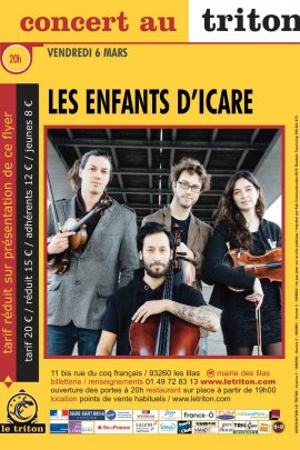 Moderniser le quatuor à cordes, développer son aspect “percussif”, le rendre autonome rythmiquement (pas de batterie, pas de percussion), tout en gardant les qualités timbrales et harmoniques qui ont été développées pour cette formation dans la tradition classique depuis plus de trois cents ans : telle est la ligne artistique développée par Les Enfants d’Icare et son compositeur, Boris Lamérand, qui est allé puiser des idées autant dans l’immense répertoire classique du XXe ou contemporain (Bartok, Darius Milhaud, Ravel, Maessian), que dans les musiques traditionnelles où les cordes sont reines (Inde, Balkans, Irlande, traditionnel américain).