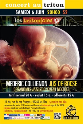 Pour cette soirée, Médéric Collignon modifie la structure des derniers projets du Jus de Bocse, “MoOvies” et “Funk’Home”, en leur faisant subir la “Trempette”, un liquide “agnostique” de jazz et d’improaux couleurs diaprées mais à la dangerosité avérée : son, tempo, phrasé, écoute, nuances, plaisir, mouvement...