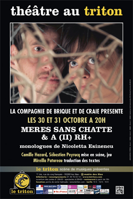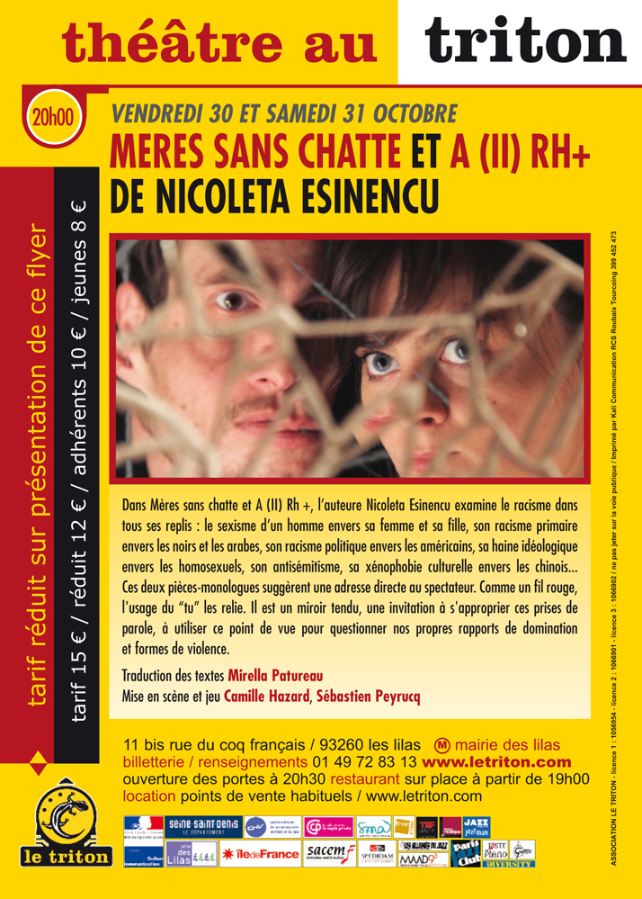 Dans Mères sans chatte et « A (II) Rh+ », l'auteure de Nicoleta Esinencu examine le racisme dans tous ses replis : le sexisme d'un homme envers sa femme et sa fille, son racisme primaire envers les noirs et les arabes, son racisme politique envers les américains, sa haine idéologique envers les homosexuels, son antisémitisme, sa xénophobie culturelle envers les chinois … Ces deux pièces-monologues suggèrent une adresse directe au spectateur. Comme un fil rouge, l'usage du « tu » les relie. Il est un miroir tendu, une invitation à s'approprier ces prises de parole, à utiliser ce point de vue pour questionner nos propres rapports de domination et formes de violence.