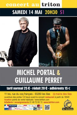 Après 22 ans d'intense activité au Triton, et quelques 2000 concerts plus tard, nous avons rarement été aussi enthousiastes et excités de découvrir ce que donnera une rencontre entre deux artistes, tel que nous le sommes aujourd'hui. Pour tous les amateurs de jazz, et plus globalement pour tous les amoureux de musique, cette rencontre entre Michel Portal et Guillaume Perret a tout de l'impensable, du rêve éveillé. D'un côté, la légende européenne du jazz, cet immense Monsieur de 86 ans aux mille vies qui chaque fois qu'il monte sur scène, avec une fougue intacte et une virtuosité inébranlable, émeut et conquiert le public. De l'autre, le plus inventif et prodigieux musicien de cette nouvelle génération d’improvisateurs qui ont à cœur de bousculer les codes, de révolutionner leur discours et d'électriser leurs auditoires. Ce soir, il ne s'agit pas d'une énième rencontre entre deux maîtres. Ce soir, c'est un véritable évènement, un coup de tonnerre et l'écriture évidente d'une magnifique page de cette histoire musicale qui n'a pas fini de nous faire rêver.