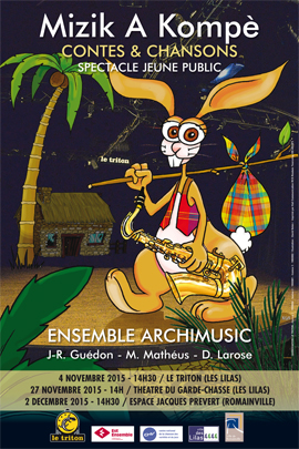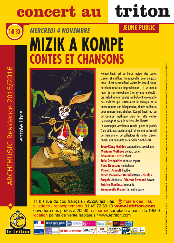 Kompè Lapin est un héros majeur des contes créoles et antillais. Immanquable pour un jazzman, il est débrouillard, contre les interdictions, excellent musicien improvisateur ! Il se met à jouer de son saxophone à un rythme endiablé ; ces mélodies tonitruantes symbolisent la revanche des esclaves qui ressentaient la musique et la danse comme une échappatoire, chants de liberté pour rompre leurs chaînes. Kompè Lapin est un personnage mythique dans la lutte contre l’esclavage et pour la défense des libertés. La compagnie Archimusic convie petits et grands à un délicieux spectacle qui fait suite à un travail de mémoire et decollectage de contes créoles auprès des habitants de la Seine Saint-Denis.
