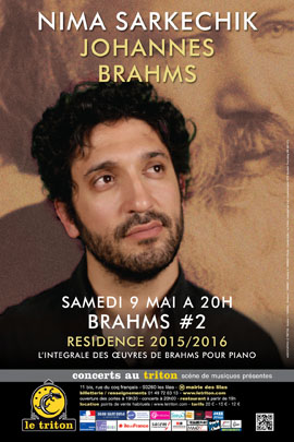 Deuxième volet de l’épopée consacrée à l’Intégrale de Brahms pour piano portée par Nima Sarkechik. Au programme : 16 valses opus 39 / Scherzo opus 4 / Sonate n.1 opus 1 ainsi que la pièce “Charlie's Angels”, spécialement écrite pour l’occasion par le compositeur et compagnon du Triton, Andy Emler. Ce concert sera enregistré et donnera lieu à l’album “Brahms#2” dont nous célèbrerons la sortie lors du concert “Brahms#3” le 19 septembre prochain.