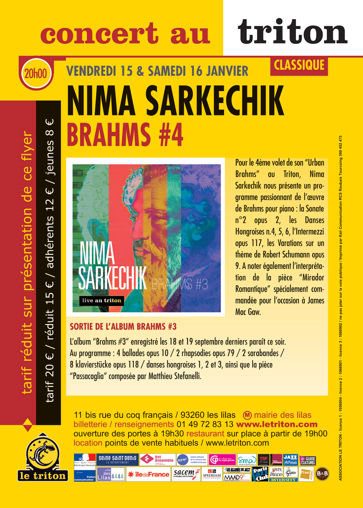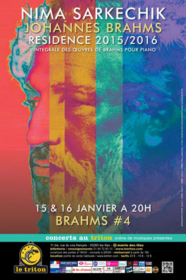 Pour le quatrième volet de son épopée « Urban Brahms » au Triton, le pianiste Nima Sarkechik nous présente ce soir un nouveau programme passionnant de l’œuvre de Brahms pour piano : la Sonate n°2 opus 2, les Danses Hongroises n.4, 5, 6, l’Intermezzi opus 117, les Varations sur un thème de Robert Schumann opus 9. A noter également l’interprétation de la pièce “Mirador Romantique” spécialement commandée pour l’occasion à James Mac Gaw. L’aventure continue, Nima poursuit sa conjugaison de Brahms au présent.
