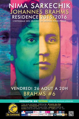 Pour finir son épopée « Brahms » au Triton, le pianiste Nima Sarkechik nous présente ce soir un nouveau programme passionnant de l’œuvre de Brahms pour piano : klavierstücke opus 116 / variations sur un thème original opus 21 n.2 / variations sur un thème original opus 21.n.1 / danses hongroises n.9 et 10 / 4 ballades opus 10. A noter également l’interprétation de la pièce, spécialement commandée 0à un compositeur contemporain surprise. L’aventure continue…