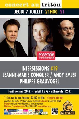 Depuis 2008, les solistes de l’Ensemble intercontemporain rencontrent des musiciens de la scène improvisée compagnons du Triton. Au programme de cette 19ème “Intersessions”, Andy Emler, grand habitué des lieux, et deux musiciens de l’Ensemble, Philippe Grauvogel et Jeanne-Marie Conquer, qui se prêtent pour la première fois au jeu de ces rencontres exceptionnelles.