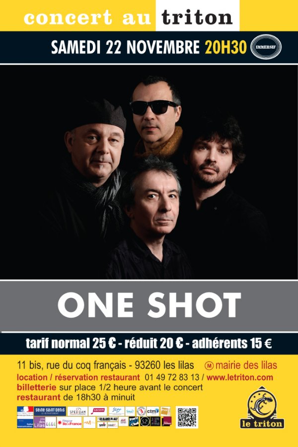 Chaque concert de One Shot est une expérience unique durant laquelle les quatre musiciens réinventent leur musique au gré de l’inspiration de l’instant. Le dernier passage du groupe au Triton, en février dernier, l’avait ainsi vu revisiter intégralement, dans des versions transfigurées, le répertoire de son dernier album studio en date, "111". Le résultat ayant suscité un enthousiasme unanime, le concert, remixé avec soin, fait l’objet cet automne d’une sortie - en numérique et donc uniquement en téléchargement. Le prétexte était donc tout trouvé pour une nouveau passage par la scène du Triton ! Aymeric Leroy