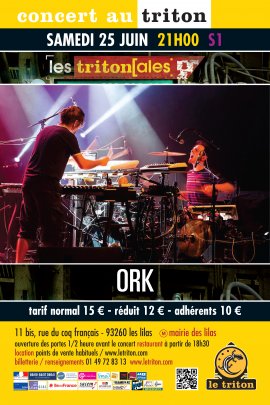Ork est une formation musicale hybride, propulsée par Samuel Klein à la batterie et Olivier Maurel au vibraphone. Un duo improbable, qui a su créer un univers propre, fantasmatique et hypnotique, à découvrir autant par les oreilles que par les yeux… Car la performance scénique d’Ork fait partie de l’essence-même de leur musique. C’est autour d’une réelle machine que s’affairent, face à face, les deux musiciens. Composée d’une multitude de câbles électroniques et de leurs instruments respectifs, dotés de capteurs, cette machine “marionnettisée” forme sur scène un véritable orchestre. Grâce à ces arrangements, leur son prend de la texture, gagne en résonance et en relief, pour concevoir une architecture musicale tout à fait nouvelle. Slalomant entre les genres électro, jazz, rock et musique contemporaine, (de Gong à Reich en passant par Magma) le duo se lance dans des improvisations, boucle les sons et repousse les limites de ses instruments...