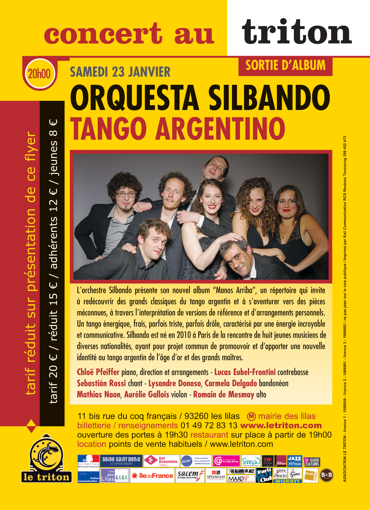 L'orchestre Silbando présente son nouvel album : "Manos Arriba", un répertoire qui invite à redécouvrir des grands classiques du tango argentin et à s'aventurer vers des pièces méconnues, à travers l'interprétation de versions de référence et d'arrangements personnels. Un tango énergique, frais, parfois triste, parfois drôle, caractérisé par une énergie incroyable et communicative. Silbando est né en 2010 à Paris de la rencontre de huit jeunes musiciens de diverses nationalités, ayant pour projet commun de promouvoir et d’apporter une nouvelle identité au tango argentin de l’âge d’or et des grands maîtres.