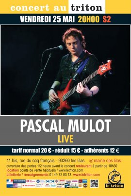 Après 4 albums et de multiples collaborations avec Steve Vai, Simmon Phillips, Steve Lukather, Patrick Rondat, Pascal Mulot a été considéré par la presse comme le premier Bass Hero français. Il revient sur la scène du Triton entouré d'Aurélien Ouzoulias à la batterie, de Renaud Louis Servais à la guitare, de François Faure aux claviers et de nombreux autres invités. Un rendez vous musical qui se veut très éclectique et généreux autours de toutes les mu-siques : Rock, Jazz, Funk..