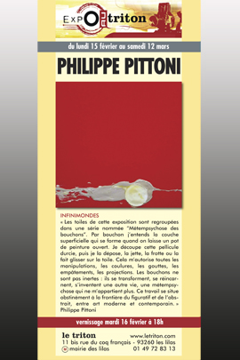 « Les toiles de cette exposition sont regroupées dans une série plus vaste nommée « Métempsychose des bouchons ». Par bouchon j’entends la couche superficielle qui se forme quand on laisse un pot de peinture ouvert. Je découpe cette pellicule durcie, avec un couteau, puis je la dépose, la jette, la frotte ou la fait glisser sur la toile. Cela m’autorise toutes les manipulations, les coulures, les gouttes, les empâtements, les projections… Les bouchons ne sont pas inertes : ils vont se transformer, se réincarner, s’inventer une autre vie, une métempsychose qui ne m’appartiendra plus. Dès lors, c’est l’originalité de la série, ils deviennent des éléments intrigants et perturbateurs. Ce travail se situe obstinément à la frontière du figuratif et de l’abstrait, entre art moderne et contemporain. »