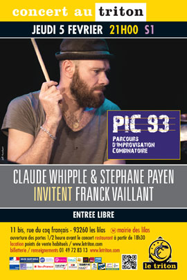 Pour cette soirée PIC 93, les formateurs et maître du jeu seront Claude Whipple (guitariste et professeur aux CRD de Bondy et Pantin) et Stéphane Payen (saxophoniste et professeur au CRD de Montreuil). Ils invitent Franck Vaillant à animer cette session d’improvisation. Franck Vaillant batterie Claude Whipple guitare Stéphane Payen saxophone Les soirées PIC, véritables spectacles construits, sont des parcours d’improvisation faits de jeux et d’épreuves. Deux musiciens enseignants et un artiste invité à animer la soirée, préparent les participants au cours de stages. Ces stages d’initiation sont organisés en amont de chaque soirée dans divers conservatoires du département et au Triton. Ils sont gratuits et ouverts à tous. Pour participer aux rencontres et aux stages PIC 93, informations et inscriptions auprès de Raphaëlle Jakobiec, raphaelle@letriton.com / 01 49 72 83 13