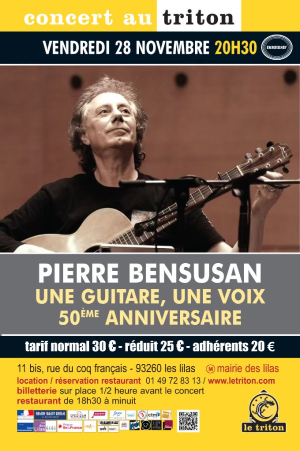 Nous sommes heureux d’accueillir Pierre Bensusan de retour au Triton après neuf mois de tournée mondiale en célébration de l’anniversaire de ses 50 ans de carrière. Longévité, résilience, fidélité, intégrité, originalité, excellence… On peut citer toutes ces qualités pour décrire l’univers de l'un des musiciens de World Music les plus éloquents de notre temps. Né en Algérie, Pierre Bensusan est compositeur, guitariste, chanteur, un aventurier de contrées insolites. Il a crée un son et une manière bien à lui d’approcher la guitare et fait partie des musiciens français d’aujourd’hui qui jouissent d’une renommée planétaire : Amérique du Nord, Europe, Chine… C'est sur les planches et au travers de nombreuses collaborations que Bensusan a gagné l'un après l'autre tous ses galons et vendu plus d’un demi-million d'albums. Il nous présentera des reprises, des nouveautés. On a hâte !
