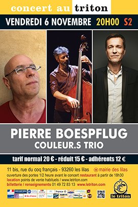 Deuxième volet du tryptique Couleur.S CREATION (Couleur.S solo et Couleur.S sextet à venir) Solidement ancré dans le monde du jazz et des musiques de création, le pianiste et compositeur Pierre Boespflug a développé un travail de réflexion et de jeu à partir des écrits d’Olivier Messiaen sur la composition. Pour ce deuxième opus de Couleur.S, Pierre Boespflug s’entoure de deux musiciens exceptionnels, tant par leur savoir-faire que par leur créativité/expressivité, et continue avec eux l’exploration du spectre musical du grand compositeur. « Il s’agit maintenant d’amener la matière de Couleur.S solo au sein du trio et, ensemble, de la façonner, la travailler et lui donner du sens. Entre l’intime et l’orchestral, l’écrit et l’improvisé, la formule ouvre à tous les possibles. Je me réjouis de cette rencontre passionnante et de pouvoir la partager »