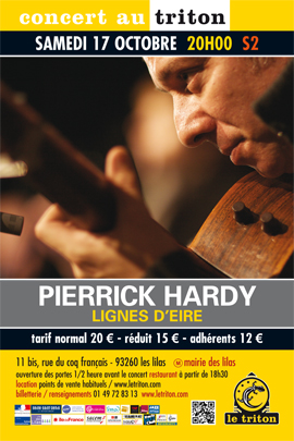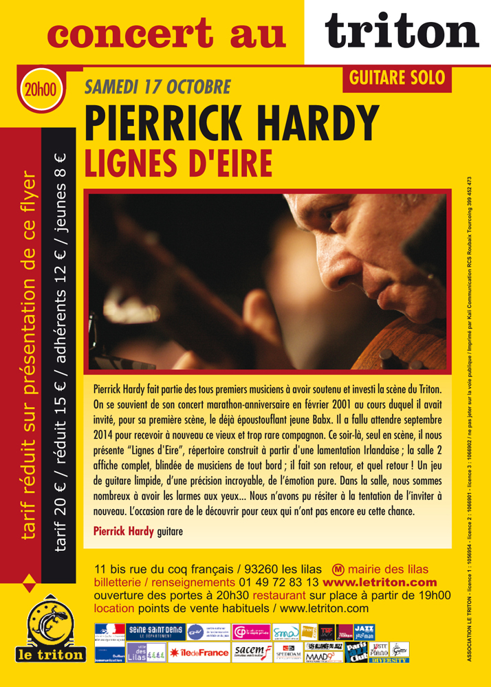 Pierrick Hardy fait partie des tous premiers musiciens à avoir soutenu et investi la scène du Triton. On se souvient de son concert marathon-anniversaire en février 2001 au cours duquel il avait invité, pour sa première scène, le déjà époustouflant jeune Babx. Il a fallu attendre septembre 2014 pour recevoir à nouveau ce vieux et trop rare compagnon. Ce soir-là, seul en scène, il nous présente “Lignes d'Eire”, répertoire construit à partir d'une lamentation Irlandaise ; la salle 2 affiche complet, blindée de musiciens de tout bord ; il fait son retour, et quel retour ! Un jeu de guitare limpide, d’une précision incroyable, de l’émotion pure. Dans la salle, nous sommes nombreux à avoir les larmes aux yeux... Nous n’avons pu résister à la tentation de l’inviter à nouveau. L’occasion rare de le découvrir pour ceux qui n’ont pas encore eu cette chance.