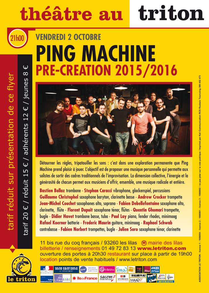 Détourner les règles, tripatouiller les sons : c’est dans une exploration permanente que Ping Machine prend plaisir à jouer. L’objectif est de proposer une musique personnelle qui permette aux solistes de sortir des cadres traditionnels de l’improvisation. La dimension collective, l’énergie et la générosité de chacun permet aux musiciens d’offrir, ensemble, une musique radicale et entière.