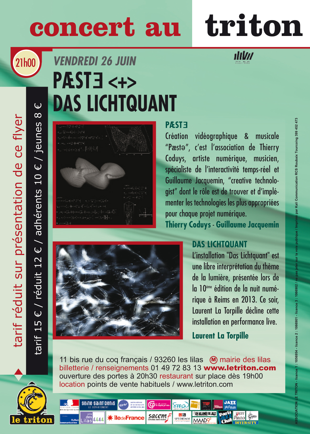 « Pæstə », c’est l’association de Thierry Coduys, artiste numérique, musicien, spécialiste de l’interactivité temps-réel et Guillaume Jacquemin, « creative technologist » dont le rôle est de trouver et d’implémenter les technologies les plus appropriées pour chaque projet numérique.
