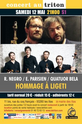 D’abord, un duo. Depuis 2015, Roberto Negro et Émile Parisien jouent en toute liberté “Les Métanuits”. Au sein de cette adaptation pour piano et saxophone du premier quatuor à cordes Métamorphoses Nocturnes de György Ligeti, ils insèrent des gestes improvisés. « Les croisements entre musique classique et jazz me sont tout particulièrement chers. Les frontières entre ces genres n’ont plus lieu d’être. », défend le pianiste Roberto Negro. D’où l’invitation qu’il lance au Quatuor Béla, avec lequel il travaille pour la première fois ici. Dans une sorte d’effet miroir, le quatuor à cordes interprétera, lui aussi, le premier quatuor des Métamorphoses Nocturnes. Ligeti le composa au milieu des années 1950 en rendant discrètement hommage à son aîné Béla Bartók dont on reconnaît le climat crépusculaire et l’écriture en variation. Une troisième partie réunit les six musiciens autour d’une pièce de Roberto Negro spécialement pour cet hommage rendu à Ligeti. Le pianiste écrit donc ici pour le célèbre quatuor auquel s’ajoutent Emile Parisien, au saxophone, et lui-même, au piano. Sa composition puise librement au sein des techniques propres à Ligeti. Lequel s’inspire autant de mécaniques diaboliques, de phénomènes musico-climatiques, d’avant-gardisme aussi bien que de folklore.