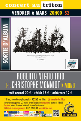 La rencontre entre Roberto Negro et Christophe Monniot remonte à 2008, lorsque le saxophoniste conviait le pianiste italien à faire partie du JPOA, orchestre composé de treize jeunes virtuoses. Immédiatement, ils se sont trouvés dans leur jazz sans frontières, aux sources et ressources multiples, où l'énergie déborde et l'humour s'invite à table. Quelques années plus tard, Roberto renvoie la pareille à Christophe et l'invite dans son trio. Depuis, le groupe se constitue en un véritable quartet, « Kimono », sulfureux et débridé.