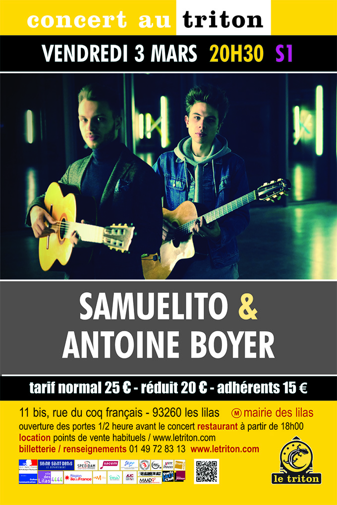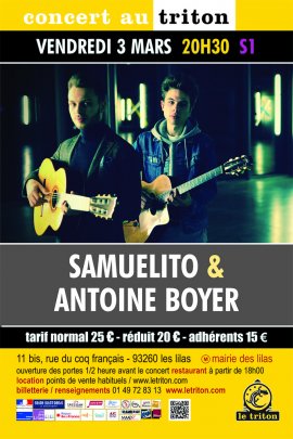 Antoine Boyer et Samuel Rouesnel, dit « Samuelito », vivent dans leur enfance la même histoire d’adoption musicale au travers de deux cultures différentes, le jazz manouche pour Antoine et le flamenco pour Samuel. Bien que venant de deux univers musicaux différents, Antoine et Samuel sont rompus à la rigueur de la guitare classique, ayant été tous deux élèves de Gérard Abiton au Conservatoire de Paris, lieu de leur rencontre. Tous les deux lauréats « Révélations Guitarist Acoustic » au tremplin de la revue nationale du même nom, le premier concert du duo se déroule en 2014. En 2016, ils sont les lauréats du European Guitar Award de Dresde, une distinction leur ouvrant accès à l’enregistrement de « Coincidence », un premier album unanimement salué par la critique. D’emblée, les deux jeunes guitaristes se démarquent de tous les duos et trios apparus dans le jazz et la world, en proposant de nouveaux chemins, nourris à la fois par leur ouverture musicale, et par cette dimension classique qui infuse leur démarche. Combinant cordes acier et cordes nylon, techniques et influences, ils développent un nouveau répertoire revendiquant l’éclectisme. En janvier 2019, Antoine Boyer et Samuelito ont participé à la tournée International Guitar Night, regroupant les 4 meilleurs guitaristes du moment et totalisant 60 concerts en Europe puis aux États-Unis et au Canada. Ce soir, c’est devant un public chanceux du Triton qu’ils posent leurs valises et qu’ils vont faire parler leur redoutable « duende ».