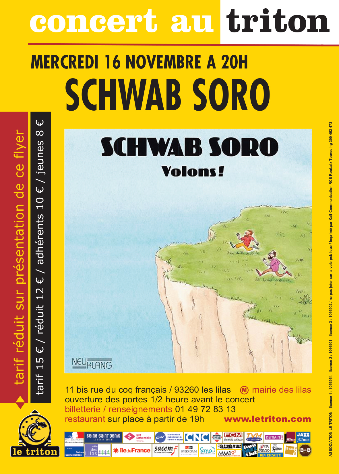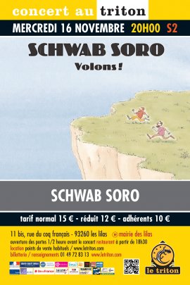 Après leur premier album « SCHWAB SORO » sorti en 2014 et salué par la critique (« Choc de l’année » et « 4 étoiles » Jazz Magazine, « Découverte » Jazz News, « Culture Jazz Oui ! »), les échappés de Ping Machine, Raphaël Schwab (contrebasse) et Julien Soro (saxophone) prennent de la hauteur avec un nouvel opus naturellement intitulé « VOLONS ! ».