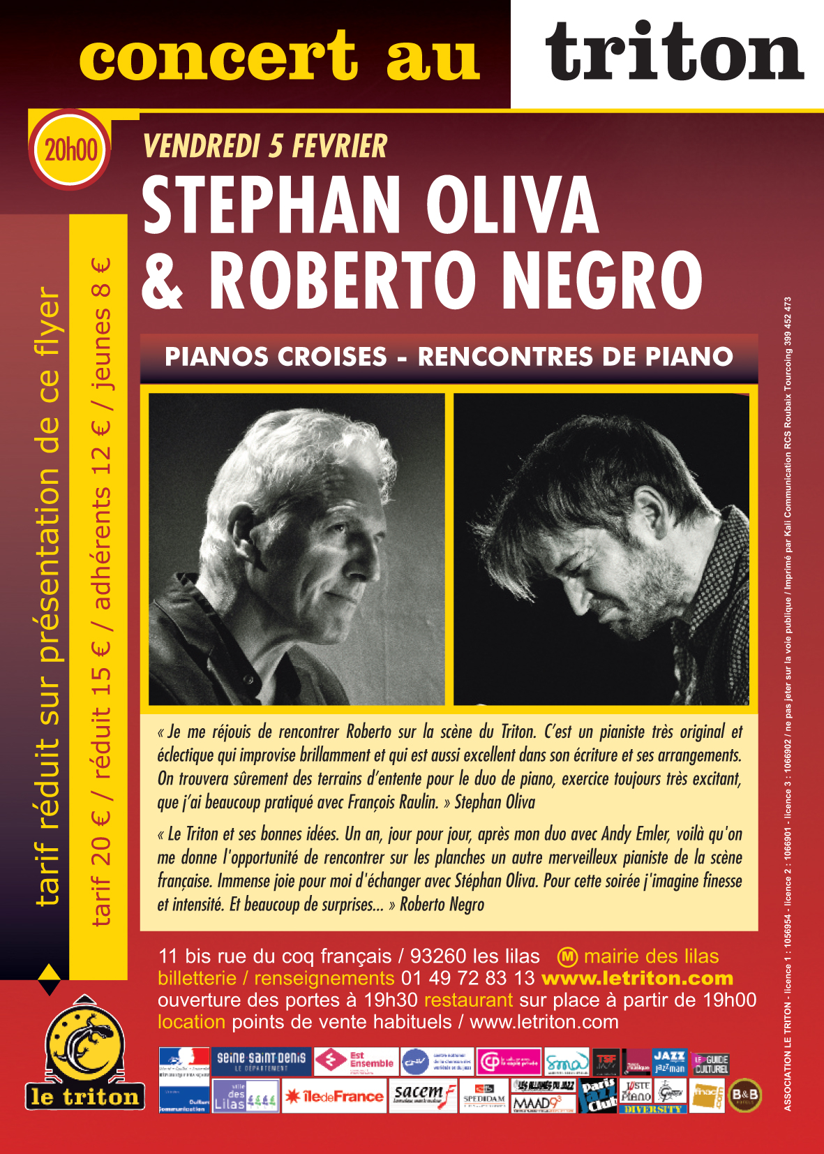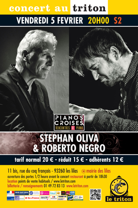 « Le Triton et ses bonnes idées. Un an, jour pour jour, après mon duo avec Andy Emler, voilà qu'on me donne l'opportunité de rencontrer sur les planches un autre merveilleux pianiste de la scène française. Immense joie pour moi d'échanger avec Stéphan Oliva. Pour cette soirée j'imagine finesse et intensité. Et beaucoup de surprises... »