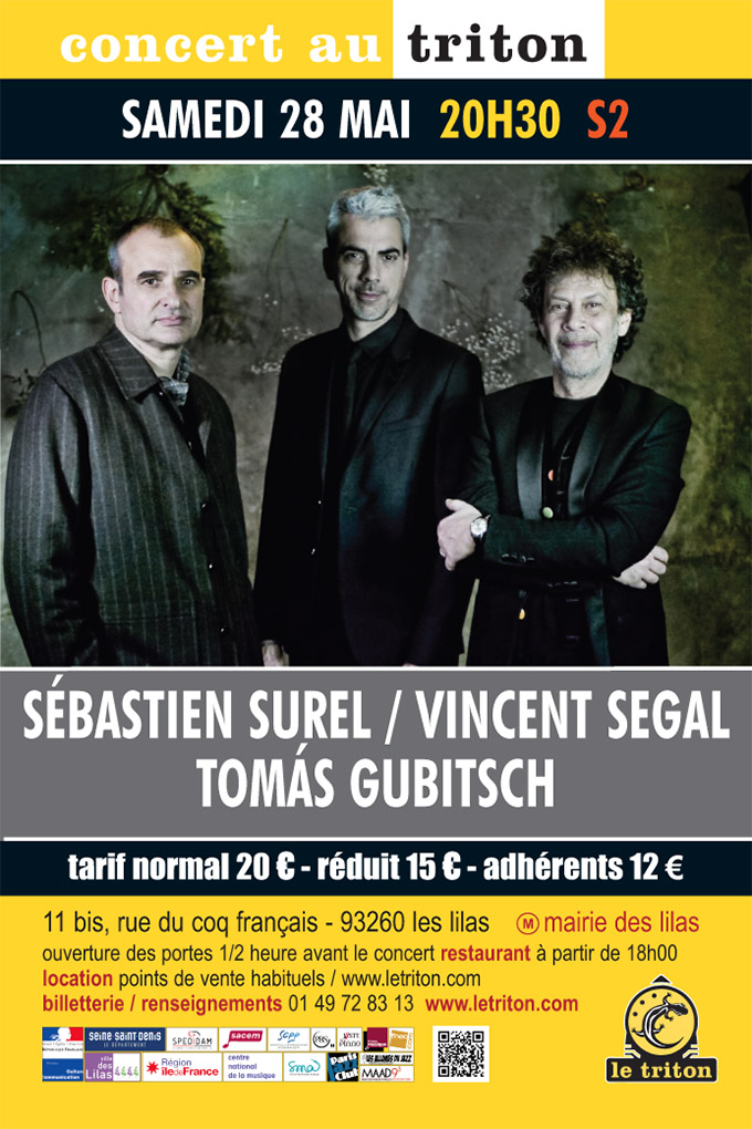 C’est en 2014 que voit le jour un nouveau trio parfaitement inclassable, « Surel, Segal & Gubitsch ». Une rencontre apparemment improbable. Trois personnalités et trois voix – aussi singulières que peuvent l’être celle du violon de Sébastien, du violoncelle de Vincent et de la guitare éclectique de Tomás – réunies autant par leurs multiples territoires musicaux communs que par leurs différences et spécificités. Leur répertoire, essentiellement leurs propres compositions, laisse également une place à des versions de pièces, entre autres, de Thelonious Monk, d’Hermeto Pascoal ou de Charlie Chaplin. Sur scène, Sébastien, Vincent et Tomás naviguent entre partitions et improvisations et se baladent entre plusieurs continents musicaux en (nous) plongeant dans la subtilité et l’intensité de leur langue commune, le son. Bref, ils jouent ensemble. Il suffit de les écouter pour se convaincre que leur rencontre apparemment improbable était, en réalité, évidente et même inévitable.