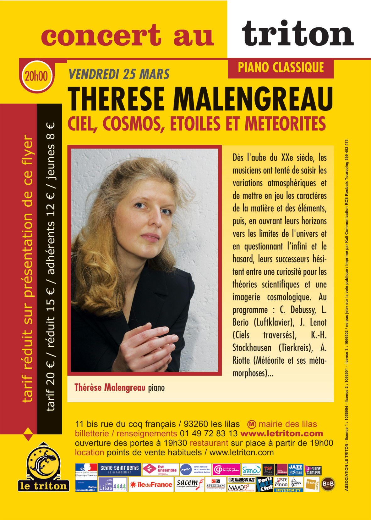 Dès l'aube du XXe siècle, les musiciens ont tenté de saisir les variations atmosphériques et de mettre en jeu les caractères de la matière et des éléments, puis, en ouvrant leurs horizons vers les limites de l'univers et en questionnant l'infini et le hasard, leurs successeurs hésitent entre une curiosité pour les théories scientifiques et une imagerie cosmologique. Au programme: C.Debussy, L.Berio (Luftklavier), J.Lenot (Ciels traversés), K.-H. Stockhausen (Tierkreis), A.Riotte (Météorite et ses métamorphoses)...