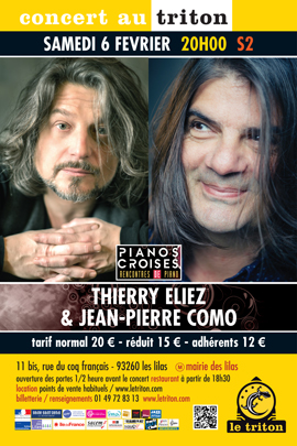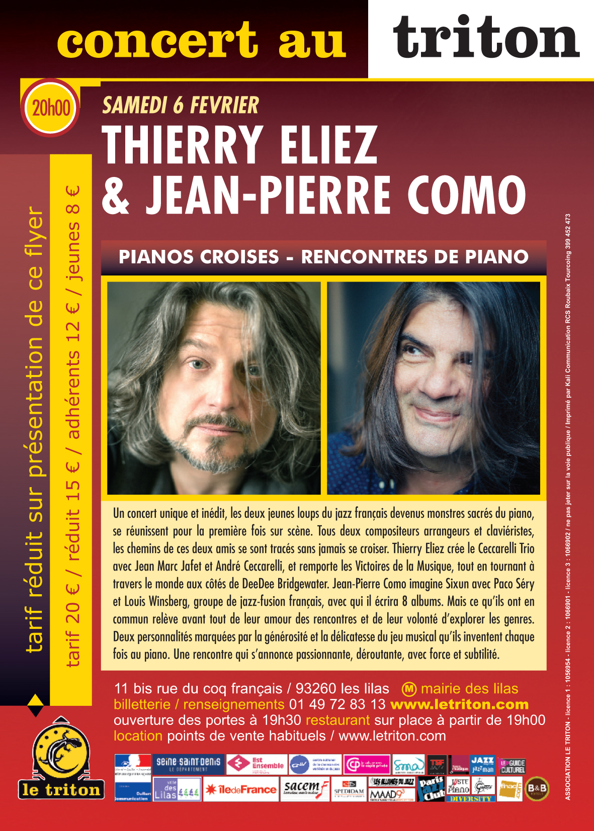 Un concert unique et inédit, les deux jeunes loups du jazz français devenus monstres sacrés du piano, se réunissent pour la première fois sur scène. Tous deux compositeurs arrangeurs et claviéristes, les chemins de ces deux amis se sont tracés sans jamais se croiser. Thierry Eliez crée le Ceccarelli Trio avec Jean Marc Jafet et André Ceccarelli, et remporte les Victoires de la Musique, tout en tournant à travers le monde aux côtés de DeeDee Bridgewater.