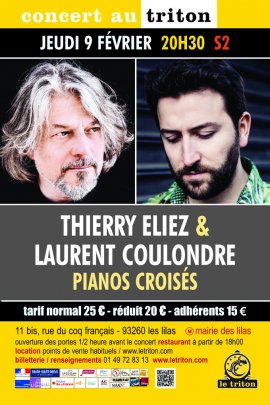 La rencontre au sommet de Thierry Eliez invitant Laurent Coulondre ce soir au Triton est une discussion inédite entre deux pianistes aux influences proches. Ils investiront leurs oeuvres respectives dans un dialogue musical libre, au rythme de leur imagination et de leurs affinités, allant jusqu’aux oeuvres qui ont marqué leurs carrières et leurs choix artistiques, de nombreuses évocations d'où l’on verra surgir un ami pour l’un, un maître pour l’autre : Petrucciani, une cadence cubaine, une ballade mythique, une oeuvre oubliée… Deux virtuoses, deux poètes, quatre mains éperdument éprises de liberté. Un véritable régal en perspective !