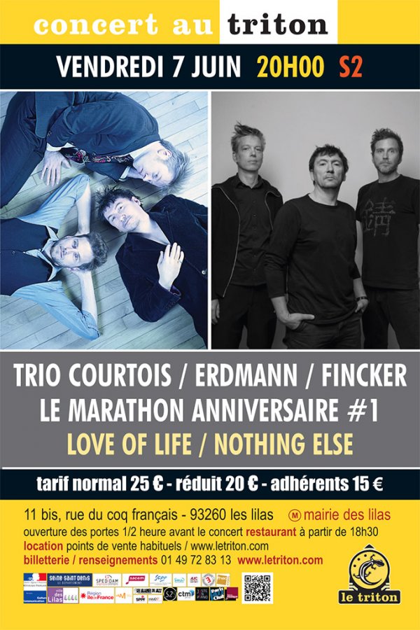 Après treize ans d’existence, cinq répertoires et cinq disques dont le célèbre "Love of Life" enregistré en Californie, une tournée aux États-Unis, d'innombrables concerts dans toute l’Europe...toujours le même enthousiasme à se retrouver pour le trio de Vincent Courtois, Daniel Erdmann et Robin Fincker. Et pour célébrer comme il se doit son quatorzième anniversaire, le trio a décidé de venir organiser au Triton une sorte de marathon anniversaire, avec une série de quatre programmes en deux soirées !