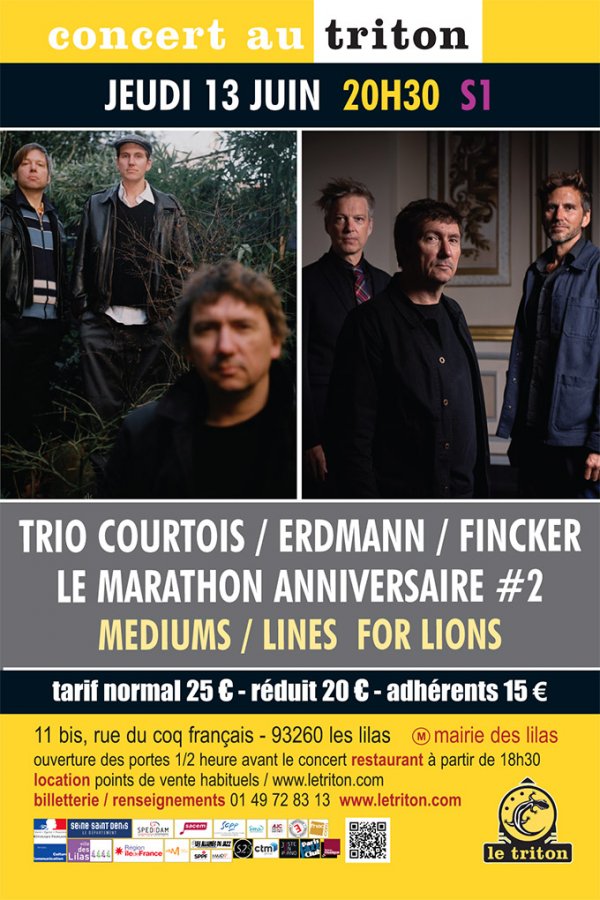 Après treize ans d’existence, cinq répertoires et cinq disques dont le célèbre "Love of Life" enregistré en Californie, une tournée aux Etats-Unis, d'innombrables concerts dans toute l’Europe...toujours le même enthousiasme à se retrouver pour le trio de Vincent Courtois, Daniel Erdmann et Robin Fincker. Et pour célébrer comme il se doit son quatorzième anniversaire, le trio a décidé de venir d'organiser au Triton une sorte de marathon anniversaire, avec une série de quatre programmes en deux soirées !
