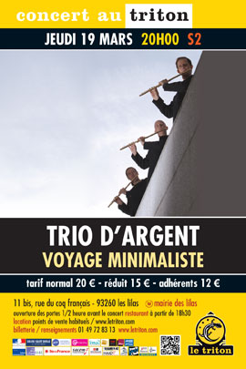 Dans un programme au caractère résolument minimaliste, les flûtistes du Trio d'Argent vous invite une nouvelle fois au voyage. Un parcours vers l'ici et l'ailleurs en compagnie de deux invités : Nicolas Vergne au piano et Grégory Feret aux percussions. Cette déambulation enchainera des pièces de Gabriela Ortiz, François Daudin Clavaud, Philippe Glass, Steve Reich, Arvo Part...
