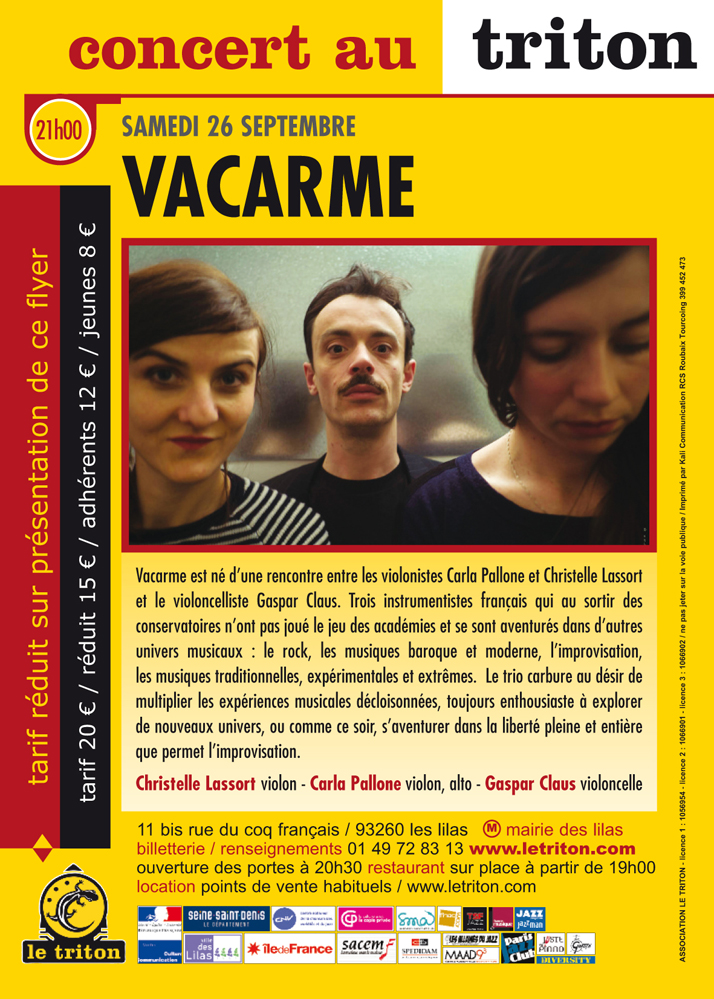 Vacarme est né d’une rencontre entre les violonistes Carla Pallone et Christelle Lassort et le violoncelliste Gaspar Claus. Trois instrumentistes français qui au sortir des conservatoires n’ont pas joué le jeu des académies et se sont aventurés dans d’autres univers musicaux : le rock, les musiques baroque et moderne, l’improvisation, les musiques traditionnelles, expérimentales et extrêmes. Le trio carbure au désir de multiplier les expériences musicales décloisonnées, toujours enthousiaste à explorer de nouveaux univers, ou comme ce soir, s’aventurer dans la liberté pleine et entière que permet l’improvisation.