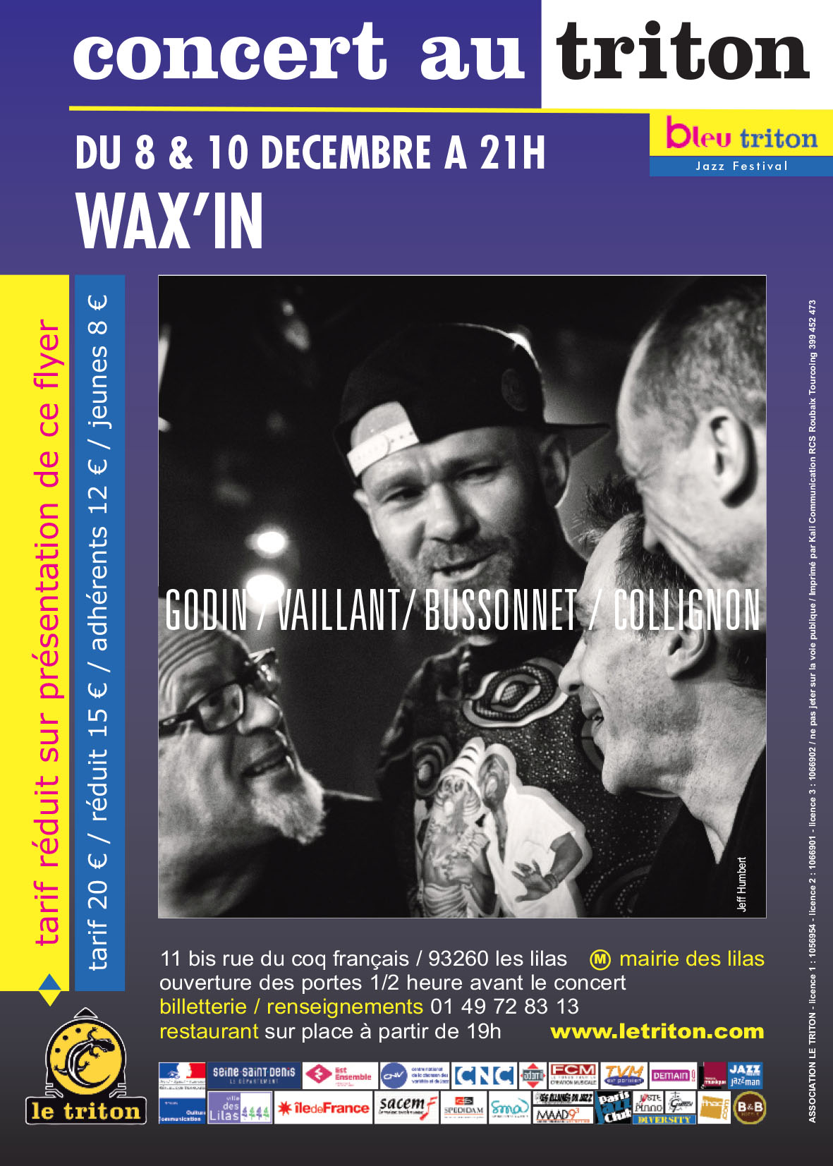Imaginez un gars qui peindrait des arabesques avec des moufles, tout en manipulant des bâtons de dynamite et en sautant à cloche-pied, et vous serez encore loin d'imaginer ce que peut vous réserver la musique de Wax'in ! Wax'in réinvente l'adage selon lequel la totalité est supérieure à la somme des parties car ici, chaque musicien semble nourri par l'énergie de ses trois partenaires, et sa prestation en est décuplée ! En écoutant Wax'in, on prend une claque tellement violente et jouissive qu'on se surprend à tendre l'autre joue en ahanant de plaisir... A la frontière entre jazz, rock, free, et esthétiques contemporaines, les quatre musiciens de Wax'In explosent les formes musicales dans un set d'une maitrise et d'une énergie peu communes.