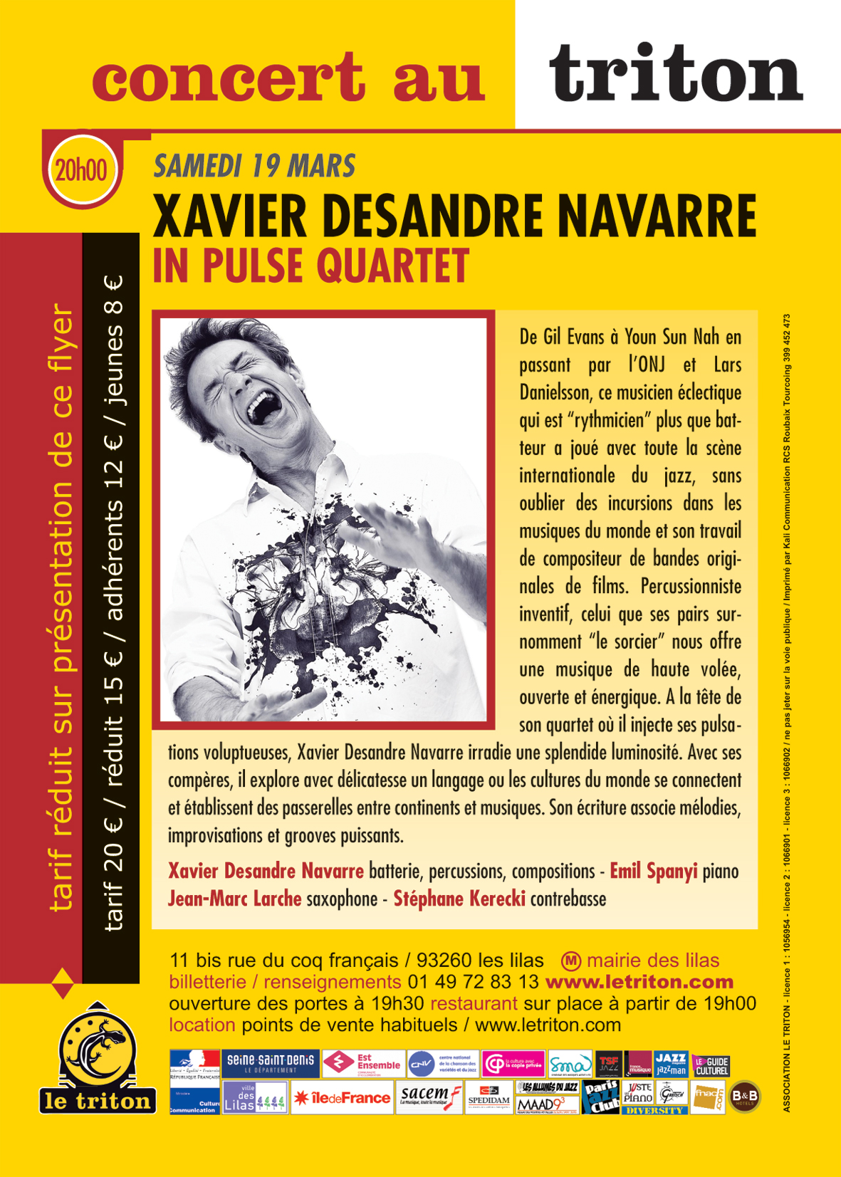 De Gil Evans à Youn Sun Nah en passant par l’ONJ et Lars Danielsson, ce musicien éclectique qui est “rythmicien” plus que batteur a joué avec toute la scène internationale du jazz, sans oublier des incursions dans les musiques du monde et son travail de compositeur de bandes originales de films. Percussionniste inventif, celui que ses pairs surnomment “le sorcier” nous offre une musique de haute volée, ouverte et énergique. A la tête de son quartet où il injecte ses pulsations voluptueuses, Xavier Desandre Navarre irradie une splendide luminosité. Avec ses compères, il explore avec délicatesse un langage ou les cultures du monde se connectent et établissent des passerelles entre continents et musiques. Son écriture associe mélodies, improvisations et grooves puissants.